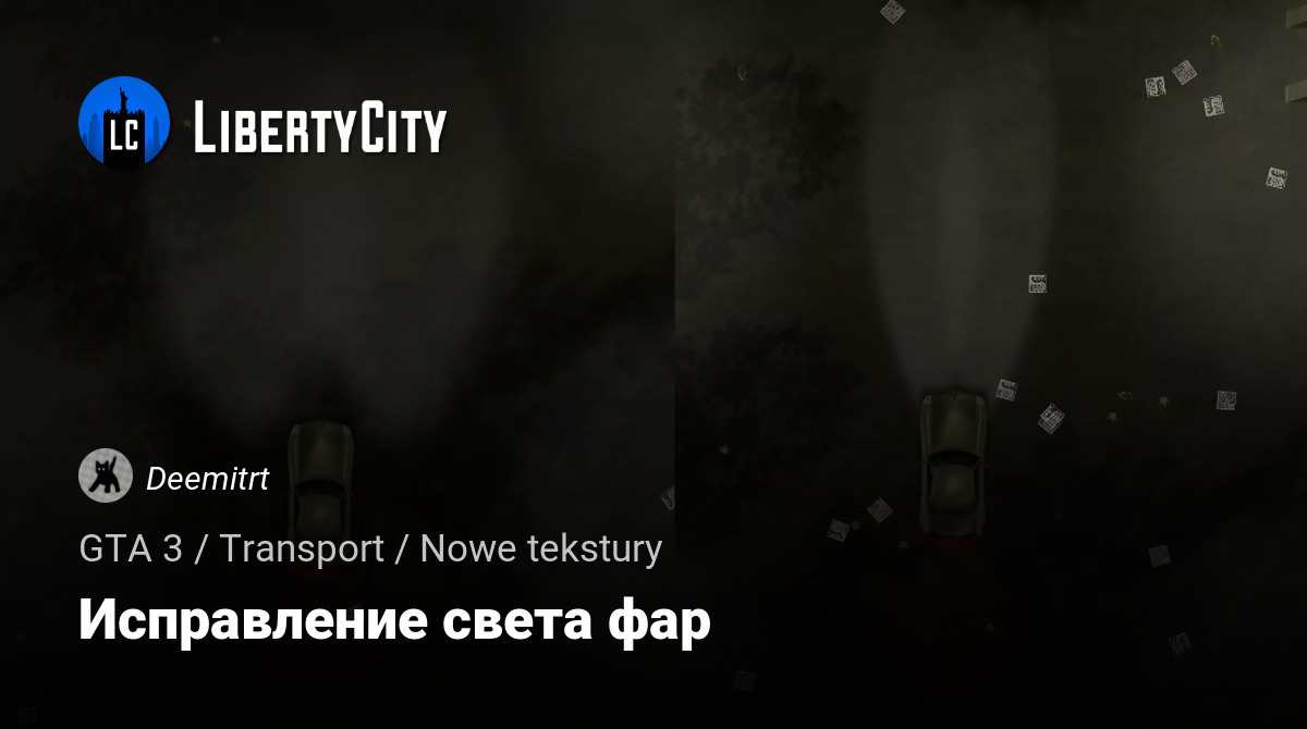 Играя в GTA 3, вы вероятно замечали, что эффект света от фар автомобилей наложен некорректно. Данный мод сужает радиус света от фар, делая эффект более похожим на тот, что был в GTA SA, а также исправляет баг с двумя линиями по бокам.