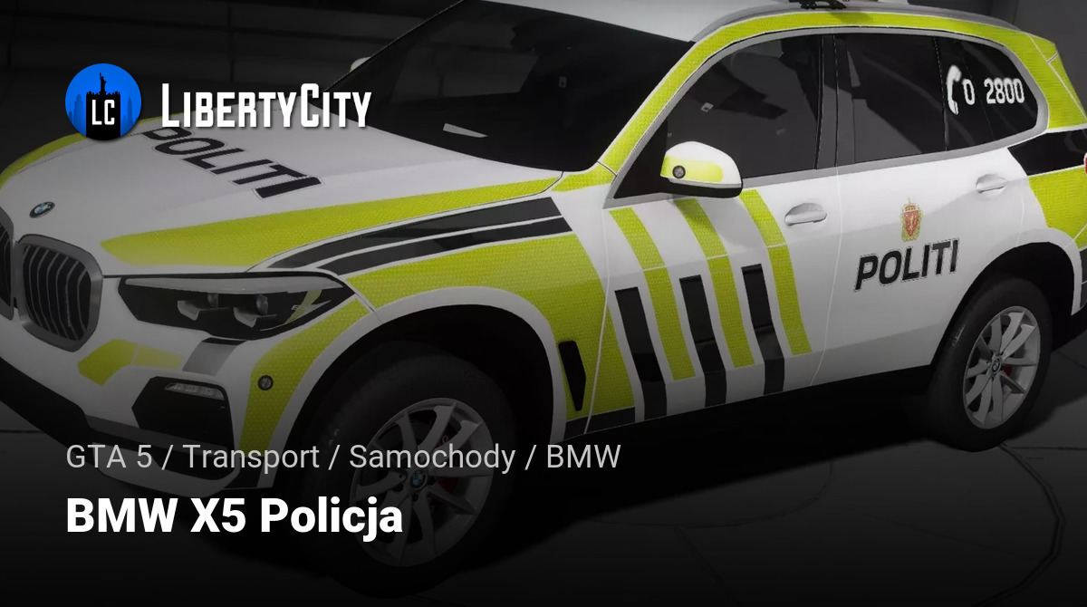 BMW X5 oznaczone „Policja”. Samochód pomalowany jest na biało z jasnymi żółtymi i czarnymi paskami, co czyni go widocznym na drodze. Na nadwoziu znajdują się również napisy „POLICJA” oraz emblemat policyjny. Pojazd wyposażony jest w reflektory LED i migające sygnalizatory na dachu.
