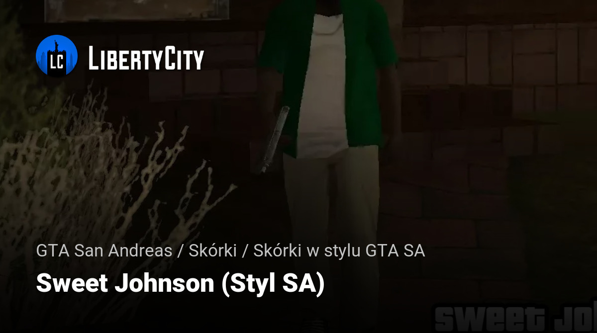 Odtworzenie klasycznego wizerunku Sweeta Johnsona z GTA San Andreas. Zielona koszula na białej koszulce, luźne beżowe spodnie i trampki — dokładna stylizacja oryginalnego stylu lat 90-tych. Zrzut ekranu zrobiony na Grove Street, podkreślający atmosferę okolicy i przynależność Sweeta do gangu Grove Street Families.